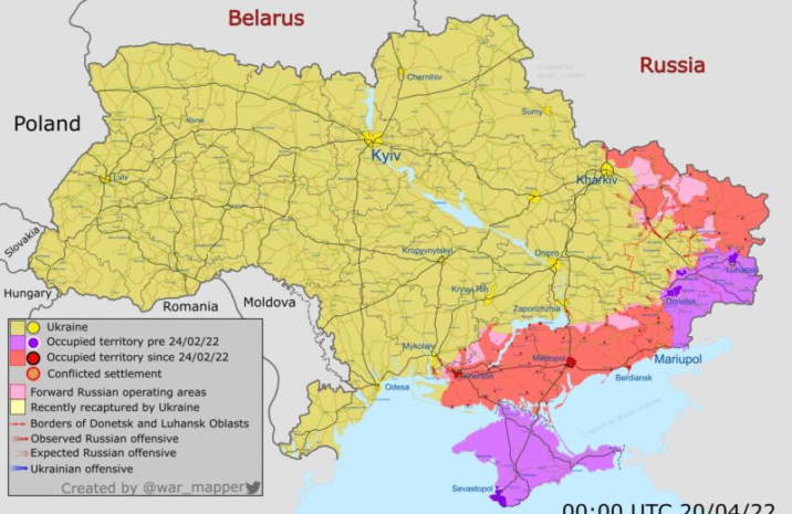 Siły Zbrojne Ukrainy poinformowały, że w dwóch najbardziej wysuniętych na wschód regionach Doniecka i Ługańska 19 kwietnia inwazja sił rosyjskich straciła 12 czołgów, jedną instalację artyleryjską i 28 jednostek pojazdów opancerzonych.