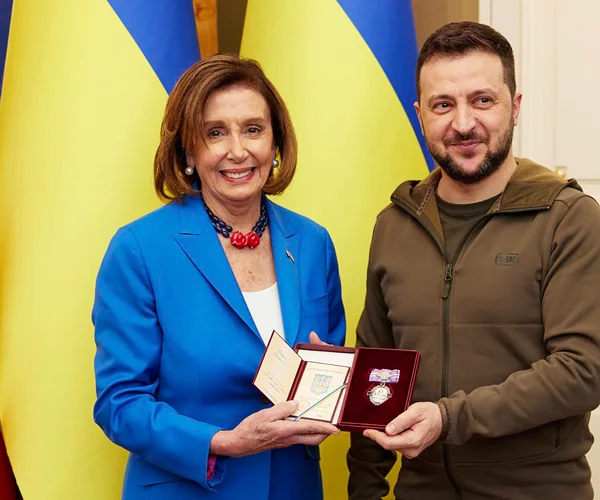 Prezydent Ukrainy Wołodymyr Zełenskij, wręczył Order Księżnej Olgi III stopnia przewodniczącej Izby Reprezentantów USA Nancy Pelosi w Kijowie, w sobotę 30 kwietnia 2022 r.