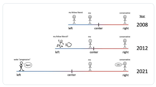 Uwagi Muska przypominają grafikę, którą zamieścił na Twitterze w kwietniu, wkrótce po tym, jak ogłosił plany zakupu platformy mediów społecznościowych. Zdjęcie przedstawiające trzy spektrum polityczne z lat 2008, 2012 i 2018 sugeruje, że jego względna postawa polityczna zmieniła się tylko dlatego, że lewicy przesunęli spektrum, idąc dalej w lewo, czyniąc Muska „umiarkowanym”.