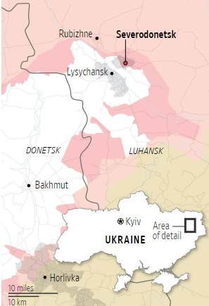 Ukraińskie jednostki wojskowe starały się zająć wyższe tereny w Łysychańsku, który znajduje się po drugiej stronie rzeki Siwerskij Doniec od Siewierodoniecka i jest mniej więcej tej samej wielkości, aby odeprzeć rosyjskie atakii próbując uniknąć otoczenia.