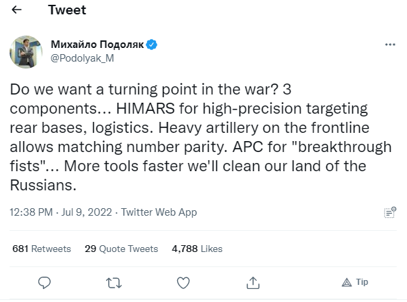 „Czy chcemy przełomu w wojnie? 3 elementy” – napisał Podolak. „HIMARS [systemy rakiet artyleryjskich wysokiej mobilności] do… neutralizowania tylnych baz, logistyki rosyjskiej. Ciężka artyleria na linii frontu umożliwiająca równowage sił na froncie. APC [transportery opancerzone] do szybkiej mobilności w przelamywaniu lini frontu nieprzyjaciela”.