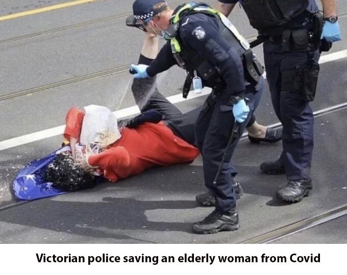 Policjanci w Wiktorii “ratują” przed Covidem starszą kobietę przy użyciu gazu łzawiącego podczs demonstracji przeciwko lockdownom
