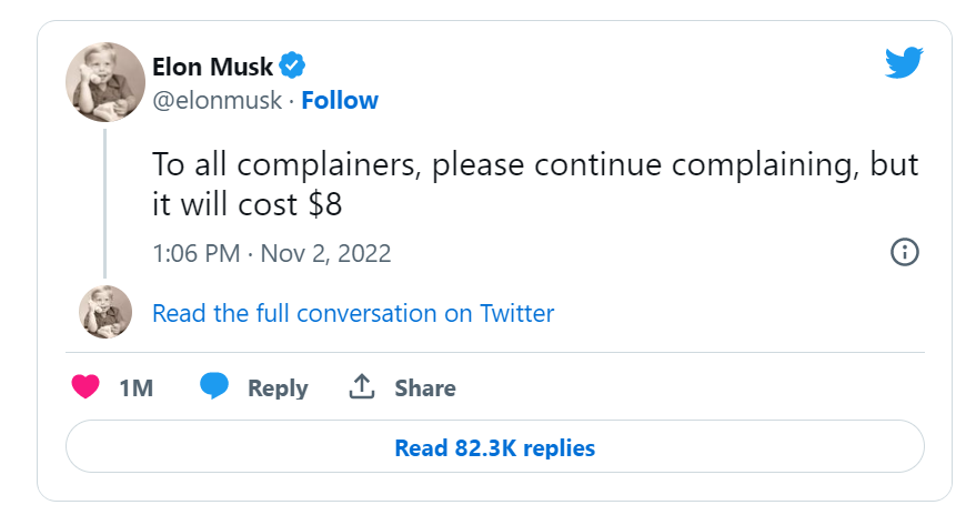 Według The New York Times i Bloomberg, powołując się na wewnętrzną dokumentację, Musk zamierza uruchomić swoją usługę subskrypcji za 8 USD dla użytkowników, którzy chcą uzyskać lub zachować znak wyboru od poniedziałku.