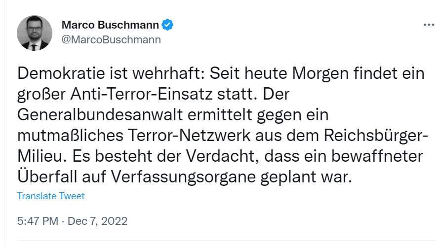 „Od dzisiejszego ranka trwa wielka operacja antyterrorystyczna. Federalna Prokuratura Generalna prowadzi śledztwo w sprawie podejrzanej siatki terrorystycznej z terenu Reichsbürgera” – napisał Buschmann. „Istnieje podejrzenie, że planowano zbrojny atak na organy konstytucyjne”.