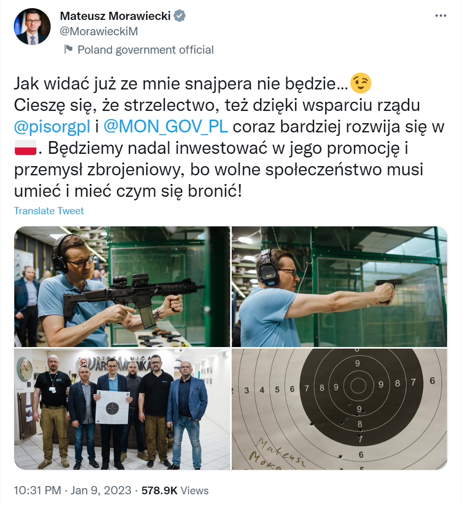 Polski premier zamieścił na Twitterze zdjęcie swojej praktyki strzeleckiej wraz z podpisem: „Cóż, wygląda na to, że nie byłbym dobrym snajperem”, dodając, że wizyta była „zabawną lekcją i doświadczeniem”.