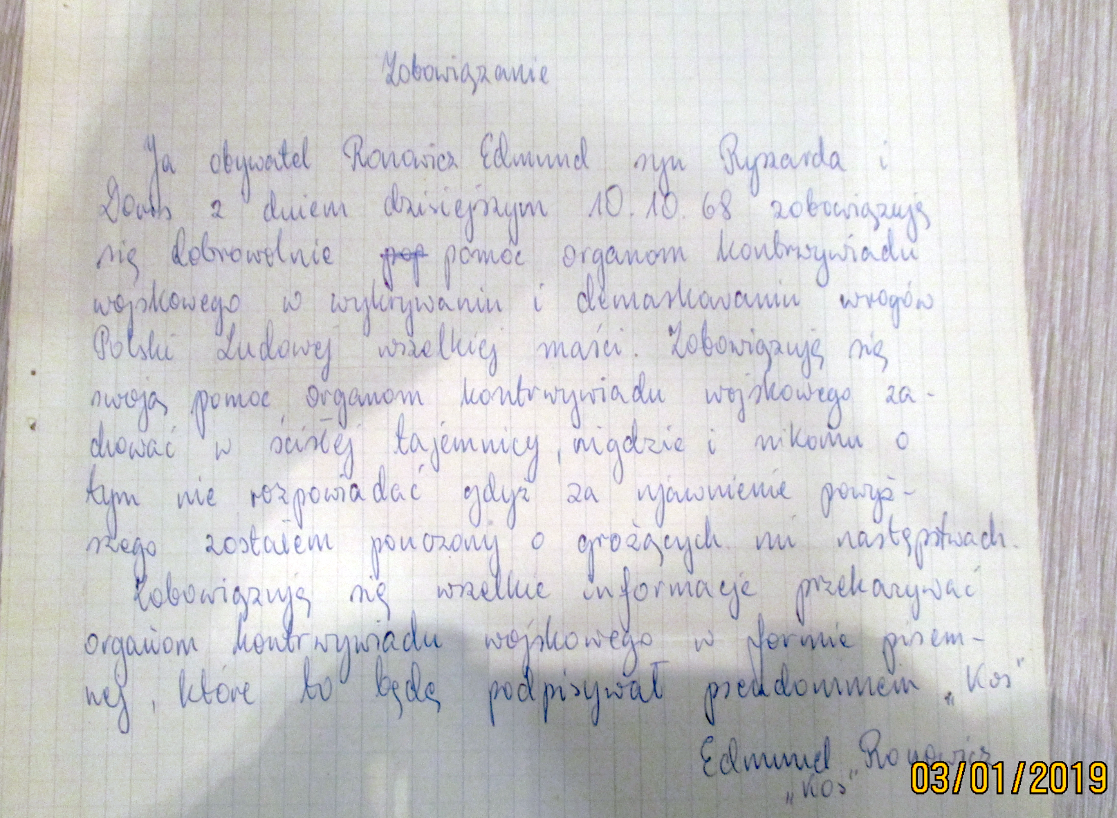 Z wyżej wymienionym podjąłem współpracę jako K.O. (Kontakt Operacyjny) w miesiącu lutym bieżącego roku. Na spotkania przychodził chętnie, przekazując informacje dotyczące stanu osobowego pododdziału w którym pełnił służbę. Jest on osobnikiem zasługującym na uwagę organizacji K.S. (Kontakty Służbowe). Kryterium proponowanej współpracy odpowiada i może w przyszłości dać cenne usługi.8