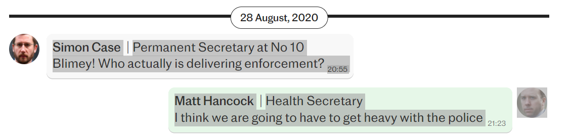 Wiadomości WhatsApp w “Dokumentach Lockdownu” ujawniają, w jaki sposób Matt Hancock i współpracownicy wydali funkcjonariuszom „rozkazy akcji” w celu egzekwowania środków zapobiegających – na kilka dni przed tym, jak sam personel kancelarii premiera zorganizował imprezkę na Downing Street.