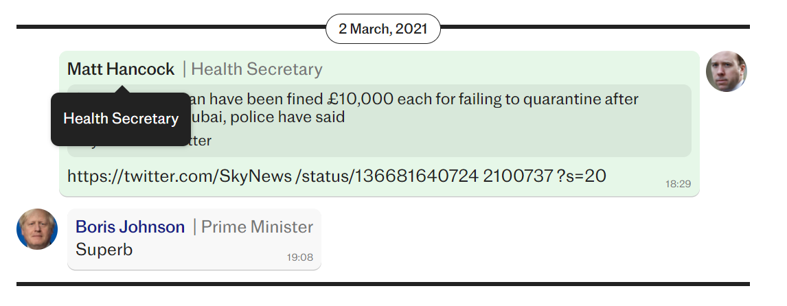 Pierwsza rozmowa odbyła się pod koniec sierpnia 2020 r. po tym, jak Simon Case, wówczas stały sekretarz w Kancelarii Rady Ministrów, zapytał pana Hancocka, ówczesnego sekretarza ds. zdrowia:
