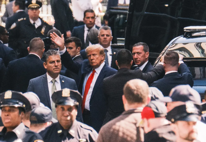 Otoczony przez Secret Service, Trump – ubrany w swój charakterystyczny ciemny garnitur i czerwony krawat – machnął ręką, zanim wszedł do biura prokuratora okręgowego, aby się poddać.