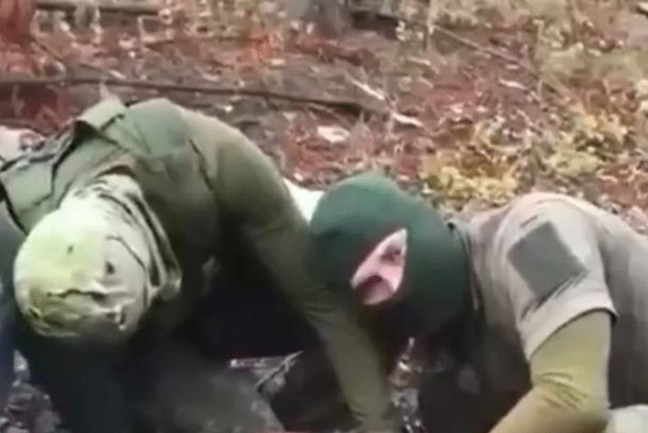 Drugi film, który został opublikowany na Twitterze i jest mocno zamazany, wygląda na nakręcony latem ze względu na ilość roślinności na ziemi. Ma przedstawiać rosyjskiego bojownika używającego noża do odcięcia głowy ukraińskiemu żołnierzowi. Głos na początku filmu sugeruje, że ofiara mogła jeszcze żyć, gdy rozpocząła się egzekucja.