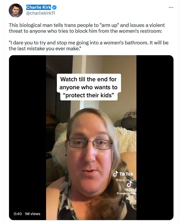 Biologiczny mężczyzna, Tara, ostrzegł swoich widzów, że jeśli ktoś będzie próbował powsztrymać go od korzystania z kobiecej toalety, stanie się on wówczas „niebezpiecznym zwierzęciem”. Tara wezwał również osoby transpłciowe do „zbrojenia się”.