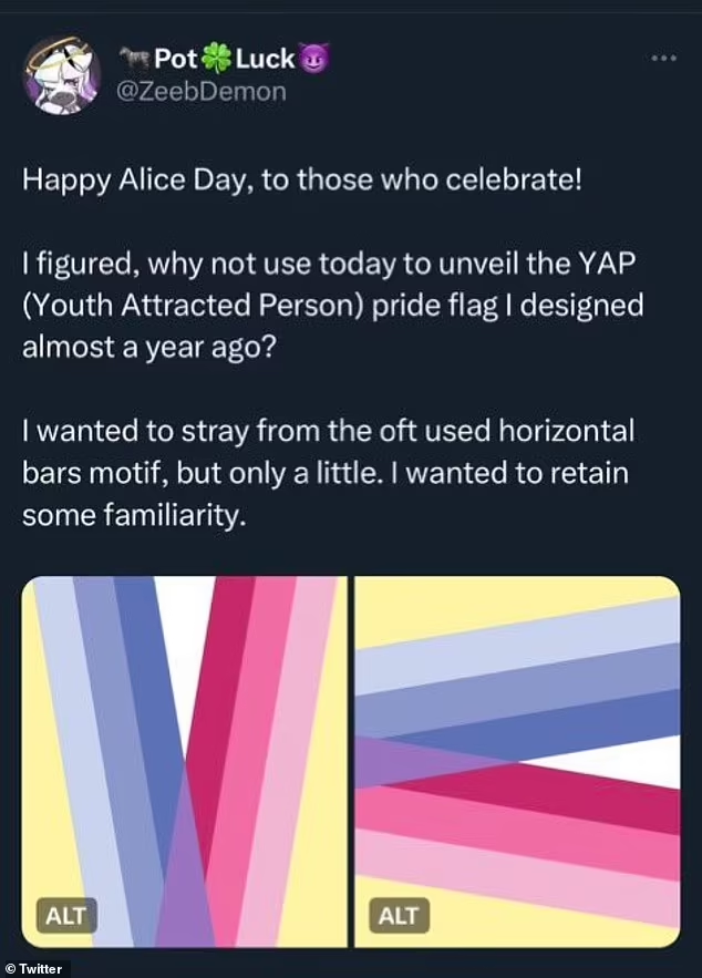 W poście (na zdjęciu powyżej) napisano: „Szczęśliwego Dnia Alicji dla tych, którzy świętują! Pomyślałem, dlaczego nie wykorzystać dzisiejszego dnia do odsłonięcia flagi dumy YAP (Youth Attracted People), którą zaprojektowałem prawie rok temu?”