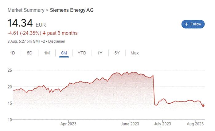 Akcje giełdowe Simensa spadły dramatycznie w lipcu 2023, kiedy po raz pierwszy ogłoszono problemy, a po większej ilości informacji — w ogóle nie wróciły do stanu poprzedniego.