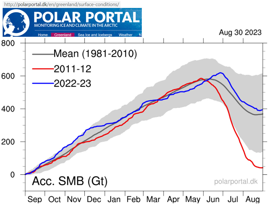 Przez większą część tego roku (od 1 września 2022 r. do 31 sierpnia 2023 r.) masa pokrywy lodowej Grenlandii znacznie przekraczała długoterminową średnią klimatyczną (1981–2010). Pokrywa lodowa Grenlandii “nie chciała nawet współpracować z narracją panikarzy klimatycznych” podczas miesięcy „globalnego wrzenia” (głównie medialnego) w lipcu i sierpniu.