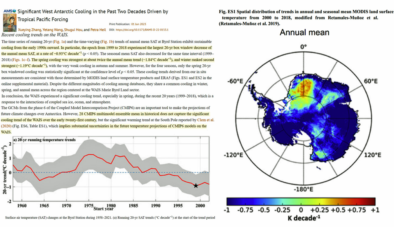 Średnie roczne ochłodzenie temperatury powierzchni kontynentu antarktycznego w latach 1999–2018 i prawie połowa SST na półkuli południowej nie potwierdzają twierdzeń, że ocieplenie powierzchni jest spowodowane emisją gazów cieplarnianych (GHG) przez człowieka.