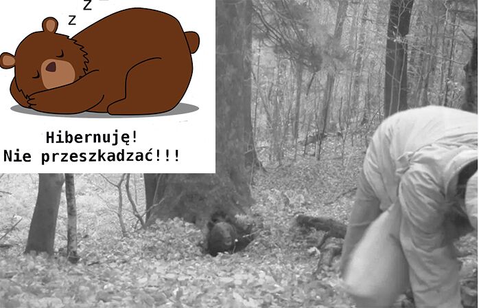 Rzecznik Nadleśnictwa opublikował zdjęcia z fotopułapki zlokalizowanej naprzeciw legowiska niedźwiedzia. Na nagraniu widać, jak niedźwiedź wyszedł ze swojej kryjówki i przygotowywał się do ataku na zbliżającego się do legowiska mężczyznę.