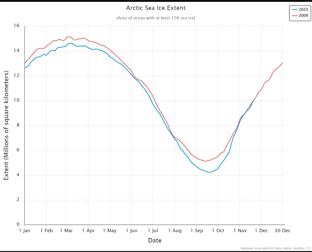 Wyraźnie widać, że zasięg lodu morskiego w Arktyce przekracza obecnie średnią z lat 2011–2020 i szybko zbliża się do średniej z lat 2001–2010. W rzeczywistości dzisiejszy zasięg wynoszący 10,019 mln km² jest większy niż w tym samym czasie w 2009 r., kiedy Gore upubliczniał swoje prognozy: