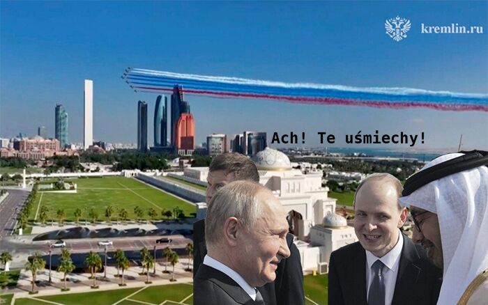 Gdy Putin wszedł na teren pałacu, który ma kopułę o średnicy 30 metrów i żyrandol z 350 000 kawałków kryształu, siedem myśliwców przeleciało obok niego w szyku dwóch przelotów nad głowami. Za nimi ciągnęła się biało-niebiesko-czerwona flaga Rosji. Trójkolorowy symbol Rosji, państwa teoretycznie izolowanego, wisiał w powietrzu nad panoramą Abu Zabi, gdy salwa honorowa obwieściła przybycie Putina.