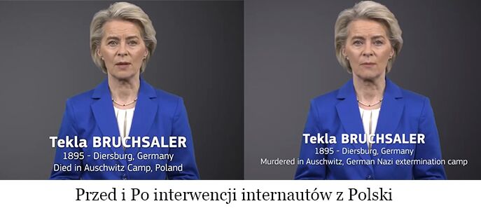 Na filmiku opublikowanym przez von der Leyen wymieniane są nazwiska ofiar Holocaustu, które poniosły śmierć w niemieckim obozie zagłady Auschwitz – Birkenau. Lokalizacja Auschwitz określona została jako „Auschwitz, Polska”. Rzecz w tym, że podczas II wojny światowej Polska była pod niemiecką okupacją, a sugestie tego rodzaju utrwalają niezgodną z prawdą historyczną narrację, jakoby Polska jako państwo była organizatorem Holocaustu. Podobnie potraktowano w filmiku Grecję i Litwę, które także były okupowane przez Niemcy.