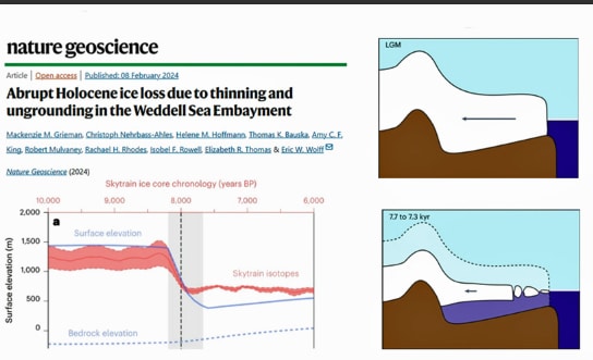 Nowe badania opublikowane w Nature Geoscience (Grieman i in., 2024) oceniają, że wysokość pokrywy lodowej Antarktydy Zachodniej spadła o ~480 m w ciągu zaledwie 200 lat od około 8000 do 8200 lat temu, co oznacza spadek o ponad 2 metry rocznie.