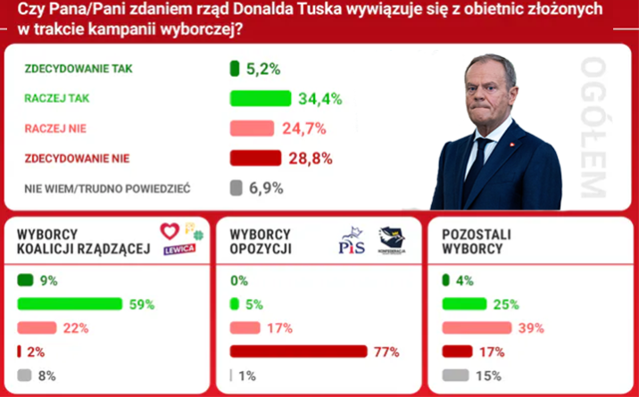 Zwolennicy Prawa i Sprawiedliwości (PiS) i Konfederacji w zdecydowanej większości (94 proc.) twierdzą, że rząd Donalda Tuska nie realizuje obietnic wyborczych.