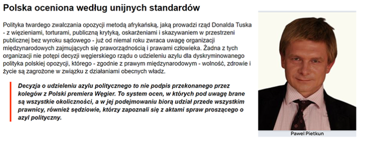 Polityka twardego zwalczania opozycji metodą afrykańską, jaką prowadzi rząd Donalda Tuska – z więzieniami, torturami, publiczną krytyką, oskarżeniami i skazywaniem w przestrzeni publicznej bez wyroku sądowego – już od niemal roku zwraca uwagę organizacji międzynarodowych zajmujących się praworządnością i prawami człowieka. Żadna z tych organizacji nie potępi decyzji węgierskiego rządu o udzieleniu azylu dla dyskryminowanego polityka polskiej opozycji, którego – zgodnie z prawym międzynarodowym – wolność, zdrowie i życie są zagrożone w związku z działaniami obecnych władz.