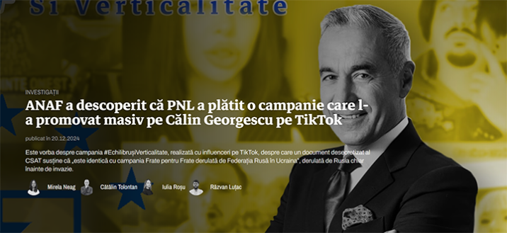 Według tego co podają dziennikarze na Snoop.ro, rumuńskiego portalu informacyjnego, rumuńska Agencja Administracji Skarbowej niedawno odkryła, że „akcję w ramach kampanii Równowaga i pionowość w TikTok opłacono pieniędzmi Partii Narodowo-Liberalnej”, a nie Rosji i Putina.