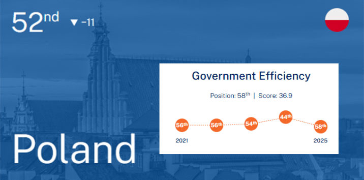 W tegorocznej edycji Polska spadła z 41. na 52. miejsce, wyprzedzona m.in. przez Litwę (21.), Czechy (25.), Łotwę (38.) i Węgry (48.). To najgorsza lokata naszego kraju od okresu 2019-22 , czyli okresu pandemii i sygnał, że konkurencyjność polskiej gospodarki wyraźnie słabnie.