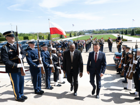 Polski minister obrony narodowej Mariusz Błaszczak rozmawia w Pentagonie z Sekretarzem Obrony Lloydem J. Austinem