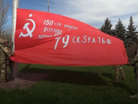 Rosyjskie wojska wznoszą sowieckie, czerwone flagi zwycięstwa w ukraińskich miastach